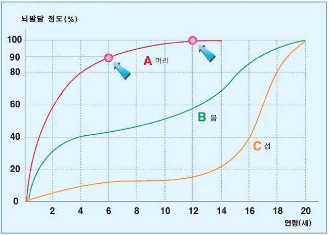 위 그림은 스케몬 곡선은 두뇌발달, 신체발달, 성발달에 대한 곡선을 보여줍니다. 그중 두뇌발달이 유아시기에 급격하게 발달한다는 것을 보여줍니다.