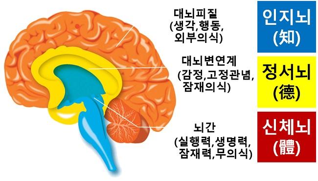 두뇌 3층 구조를 지, 덕, 체라고 할 수 있는데 이는 우리나라 교육에서 강조하는 것이기에 교육이 두뇌의 발달과정을 담았다고 할 수 있습니다.