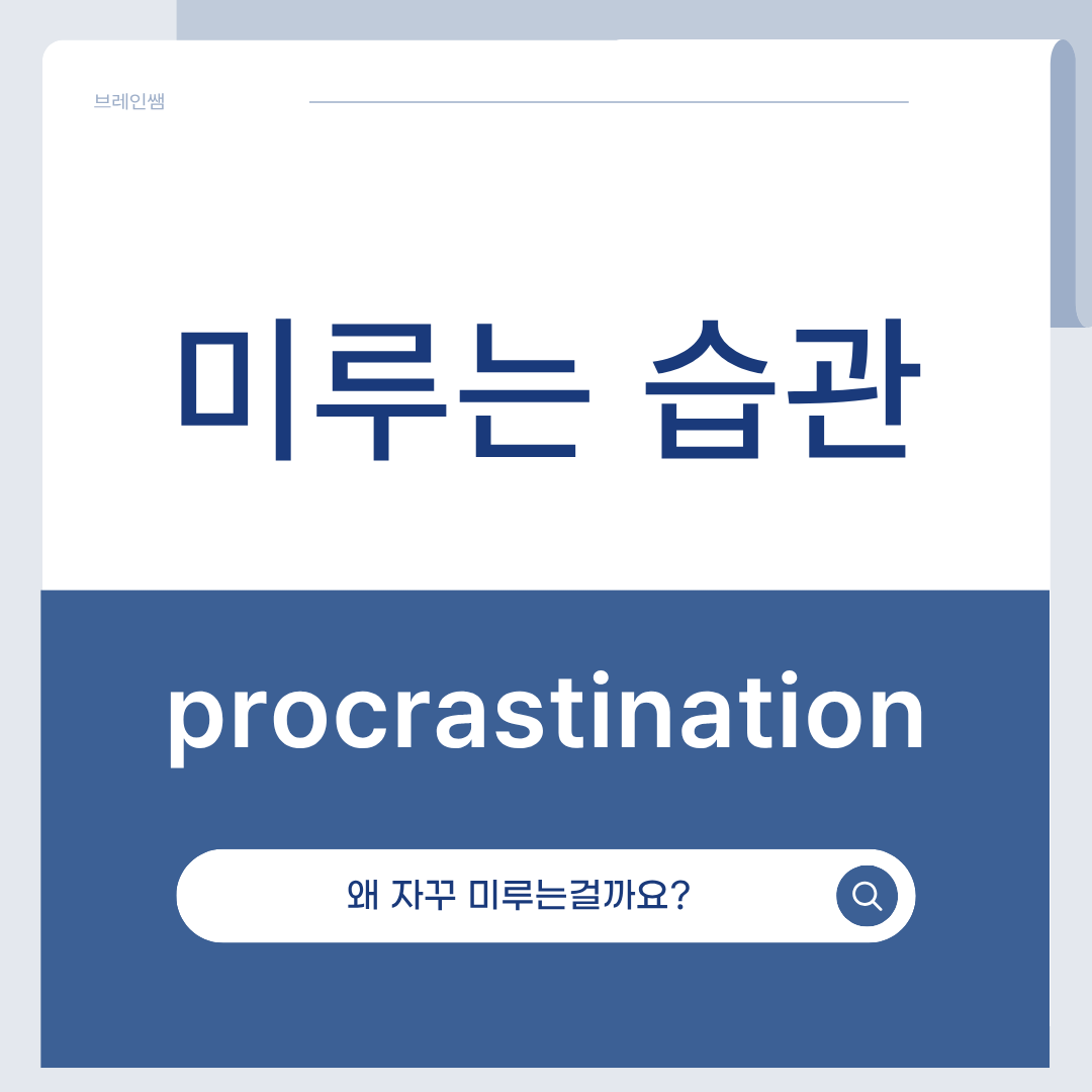 일을 바로 하지 않고 계속 미루는 심리를 심리학에서는 ‘프로크래스티네이션(procrastination, 미루기 습관)’이라고 한다네요.
